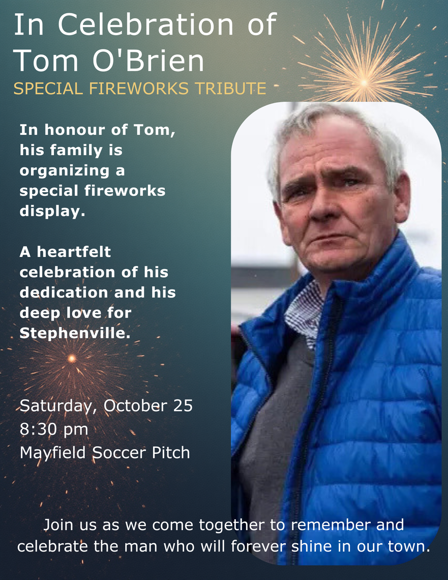 Tom’s family will be hosting a fireworks display at the Mayfield Soccer Pitch on Saturday, October 25, at 8:30 p.m.